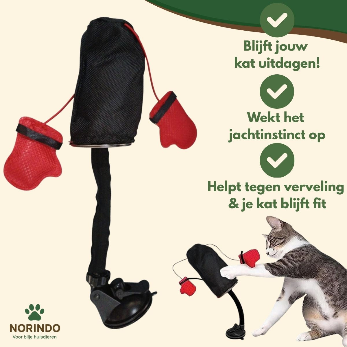 Ja! De Norindo PunchPole beweegt op een natuurlijke, onvoorspelbare manier, waardoor katten elke keer opnieuw geprikkeld worden. Het bootst het jachtgedrag na dat katten in de natuur vertonen – dat blijft spannend en uitdagend, zelfs na weken spelen.
