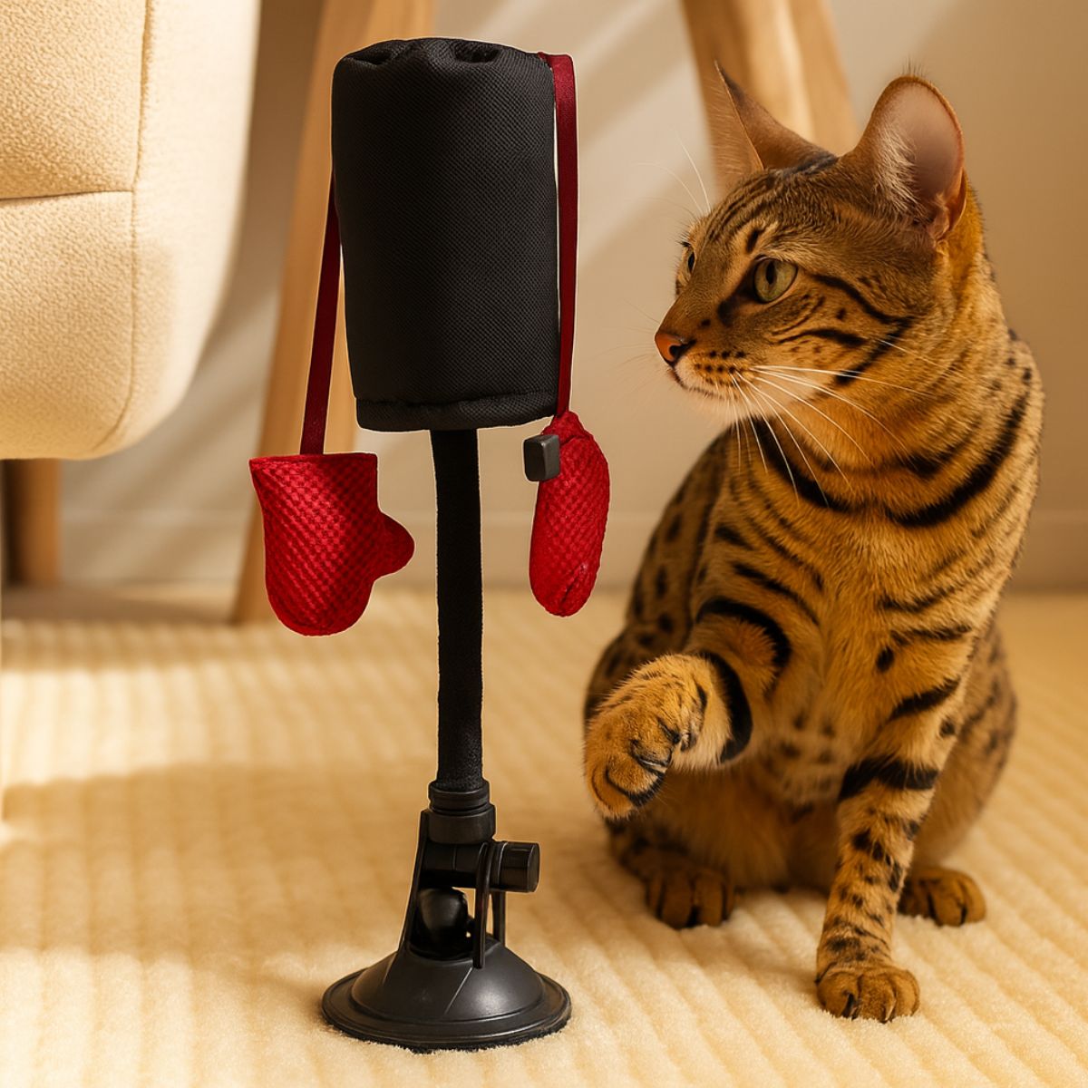 Ja, absoluut! De PunchPole is gemaakt van niet-giftige, diervriendelijke materialen zonder scherpe randen. De stevige constructie en veilige zuignap aan de onderkant zorgen ervoor dat het speeltje stabiel blijft, hoe enthousiast je kat ook speelt.