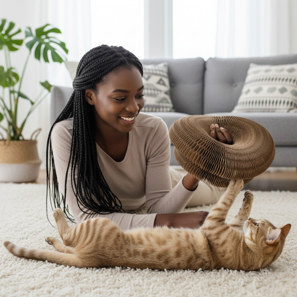 Het karton dempt geluid en biedt een vezelige grip die katten heerlijk vinden, zonder piepjes of rammels in je woonkamer.